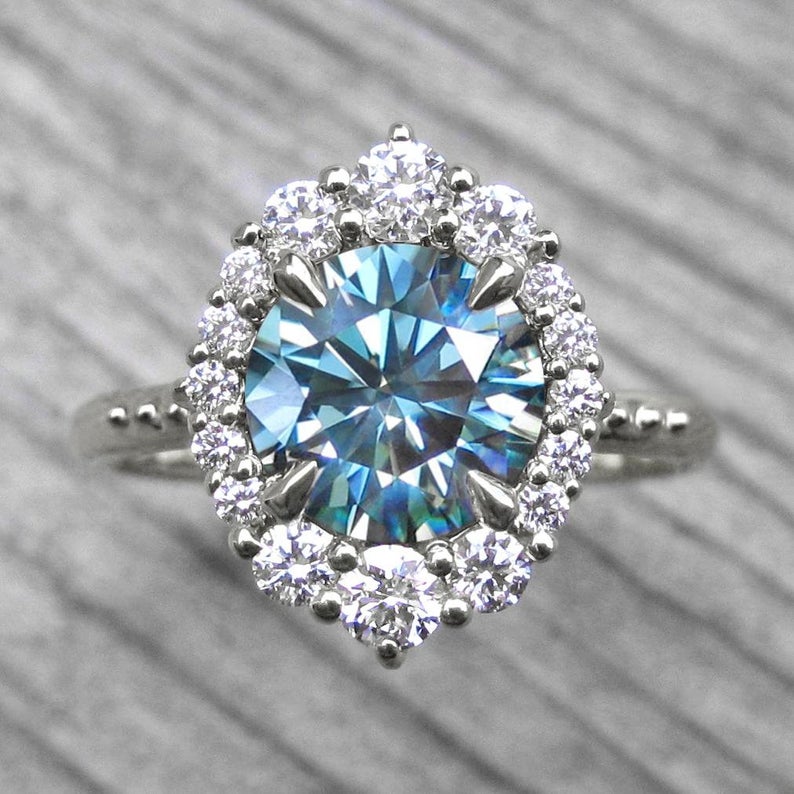 1.5 Carat Blue Round Cut Diamond Engagement Ring for Women, Wedding Ring, Halo Engagement Ring, Anniversary Gifts